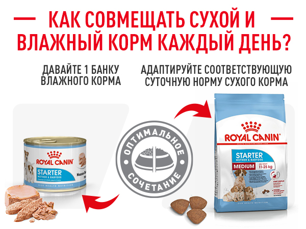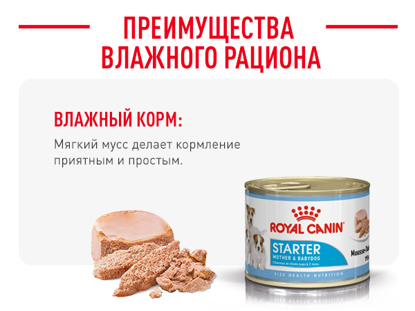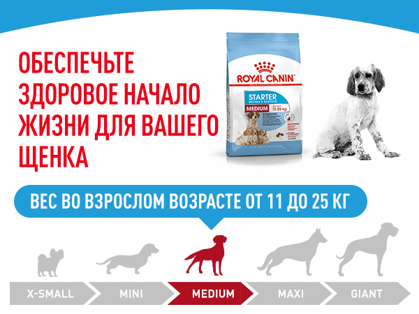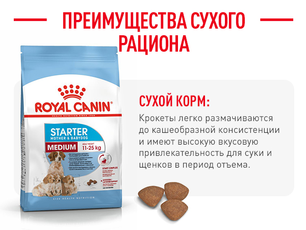 Раціон ROYAL CANIN Starter Mother & Babydog Medium розроблений для цуценят собак великих розмірів, вага яких у дорослому віці від 11 до 25 кг. Сука у період вагітності та лактації, цуценята від відлучення до 2 місяців