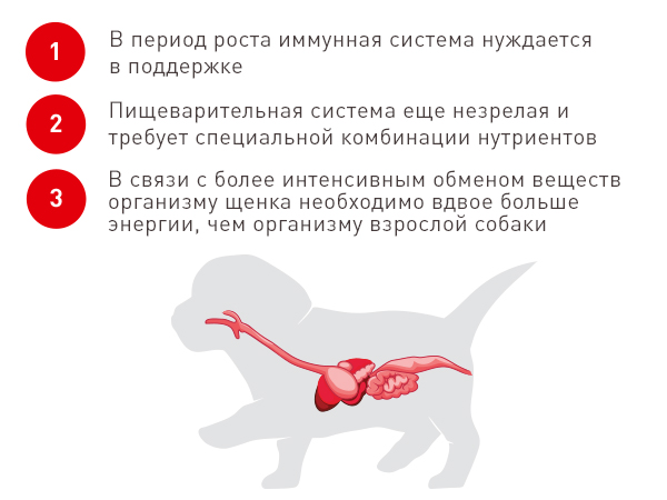 Організм цуценяти постійно росте: склад, текстура та розмір корму повинні бути адаптовані до віку цуценяти. Раціон у період росту відіграє ключову роль у морфології та здоров’ї цуценяти в майбутньому.