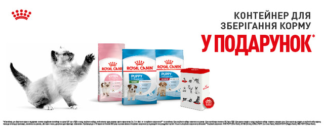 *«Контейнер для зберігання корму в подарунок» означає придбання контейнеру за ціною 0,01 грн з ПДВ в складі акційного набору, який включає одну упаковку сухого корму вагою 2кг, 3 кг або 4 кг із акційного асортименту** та контейнер. Ціна акційного набору зазначена на ціннику. Ціна контейнеру становить 00,1грн.з ПДВ. Ціна решти товарів у складі акційного набору становить залишок ціни. ціни. Цінакормів що, входять в акційний набір окремо, чинна до початку дії пропозиції,зазначена на цінниках, або іншим чином, доступним для перегляду споживачем.