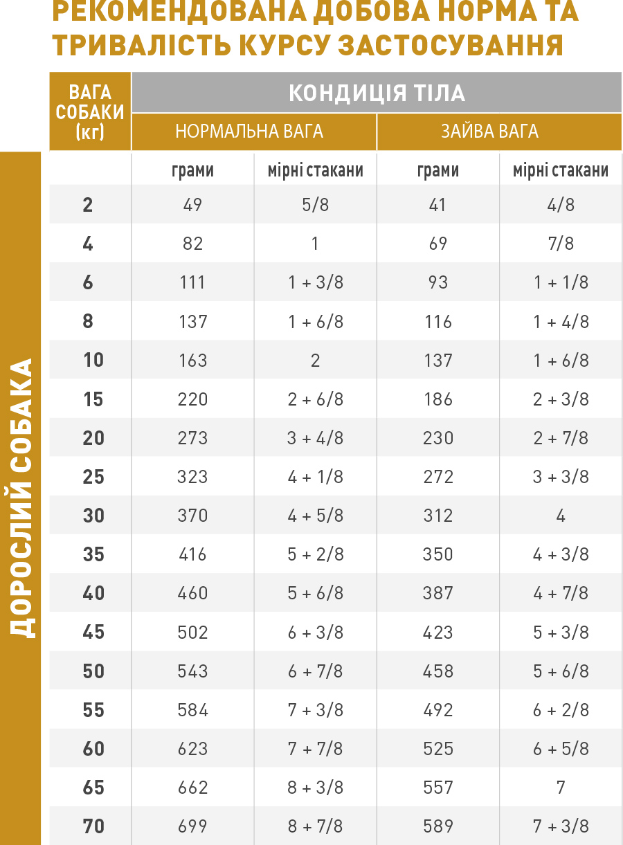 Собакам зрілого віку необхідно перевірити функціонування нирок, перш ніж рекомендувати раціон Urinary S/O. Добовий раціон рекомендується розділити на 2 годування.